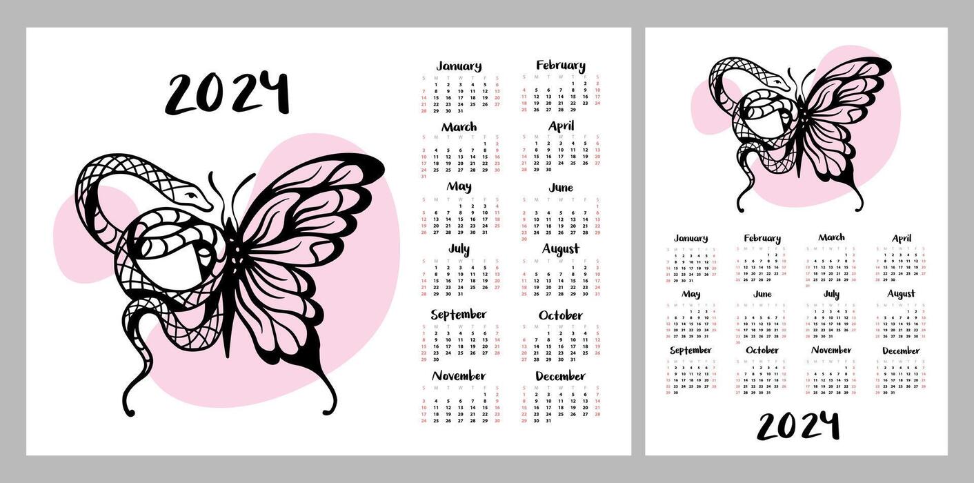 Calendar layout for 2024. Girls’ tattoos of a butterfly with a